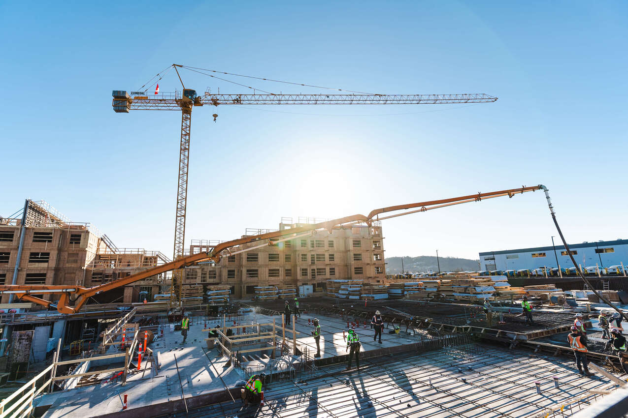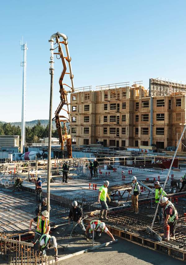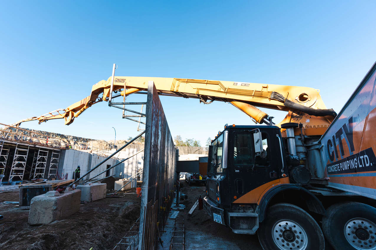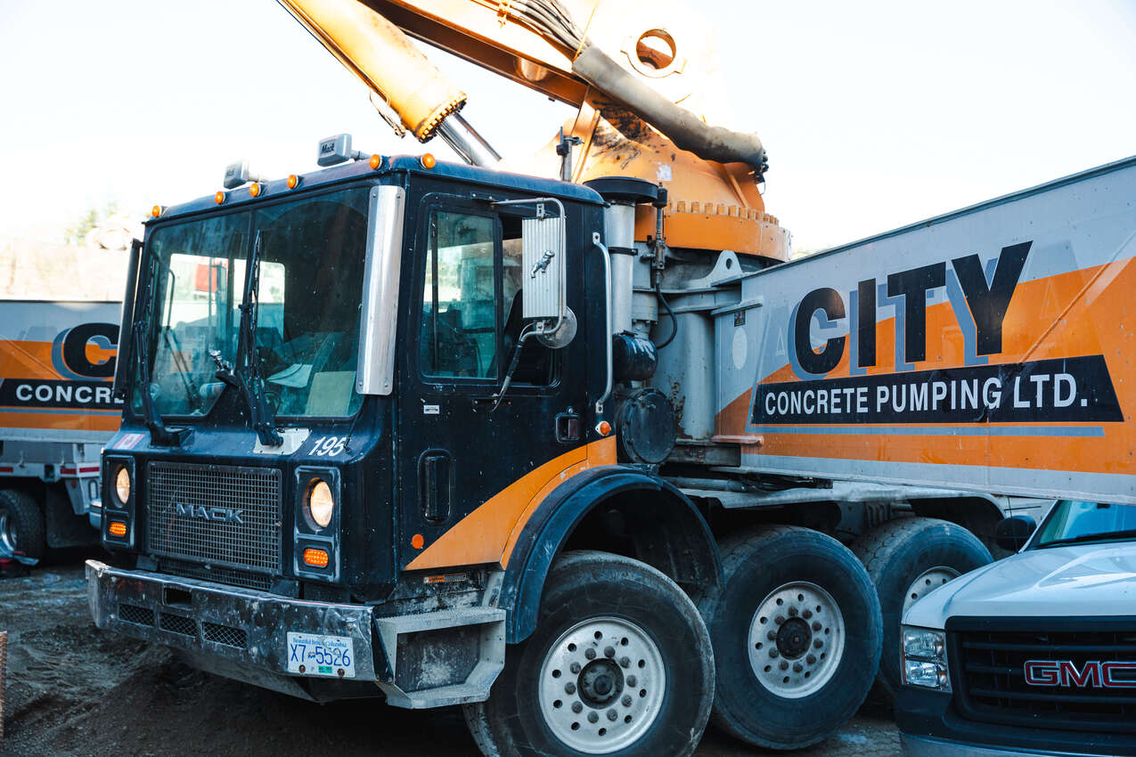 The largest boom pump in the fleet. When the distances are pushing 180ft straight up or across a playing field, this Concord based pump can really solve headaches. When a worksite gets complicated, project managers delight in the elegant solution of a single boom pump that can overcome the need to use a crane, line pumps or multiple smaller pumps. “The Boss” was the pump of choice for two massive projects in downtown Victoria, 1515 Douglas Street and Yates on Yates. Both had extensive underground work and required the full reach of the 56 meter boom on the upper levels.
